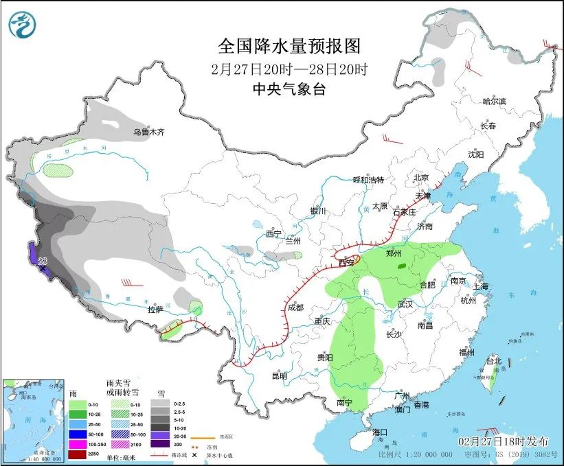 - 27日20时至28日20时,西藏西部和北部、新疆沿天山地区和西部、内蒙古东北部、黑龙江北部、甘肃南部等地部分地区有小到中雪或雨夹雪,其中,新疆西南部、西藏西部等地部分地区有大到暴雪,局地大暴雪。陕西南部、河南、江苏北部、安徽北部、湖北北部和西部、湖南西部、贵州东部、广西、台湾岛东部等地部分地区有小雨,其中,河南东部局地有中雨。